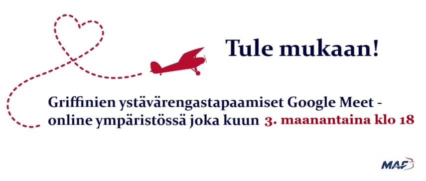 Tervetuloa mukaan ystävärenkaaseen kaikki MAF:n ja Peter ja Päivi Griffinin työstä kiinnostuneet. llmoittaudu mukaan Peter ja Päivi Griffinin ja MAF:n työn tukijaksi alla olevalla lomakkeella.Samalla saat heidän uutiskirjeensä.